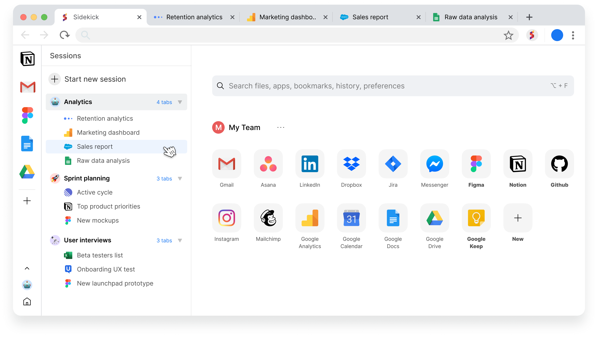 Stop wasting time with bookmarks. As you work, Sidekick automatically saves your open tabs as a session. From our side panel, you can quickly start a new session or open all the tabs of a saved session.